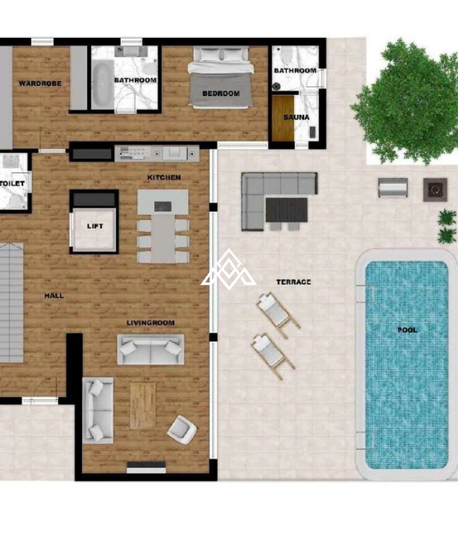 Main floor: Elegant entrance hall, open-concept kitchen integrated with the spacious living area, guest toilet, one large bedroom with independent bathroom, and a sauna. Ceilings on this floor reach approx. 4.6 meters.